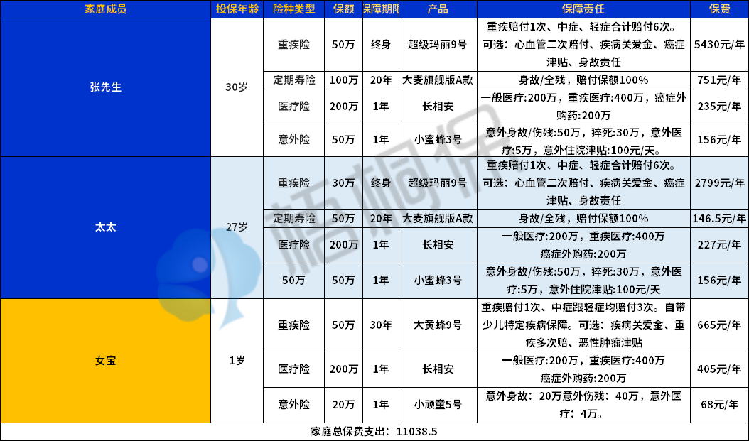 这样规划的重点,可以很明显的看到,都是集中在张先生身上。因为,家庭保险预算有限,所以相应的保障重点可以先往张先生这边做倾向。后续,等经济宽松太太跟孩子的再可以适当性的加保都可以。