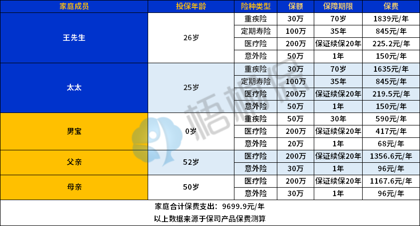 王先生跟爱人都是上班族,王先生26岁、王太太25岁、宝宝0岁刚出生、老爸52岁、老妈50岁。