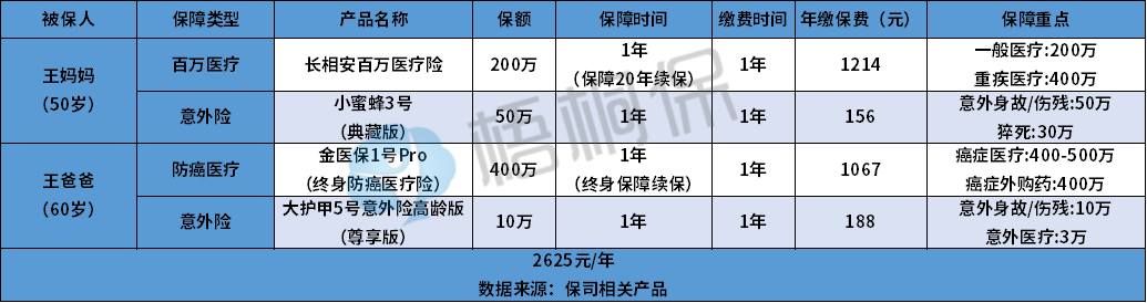 其次,就是王爸爸的产品,王爸爸因体况原因,医疗险退而求其次选择的是防癌医疗险。防癌医疗虽不如百万医疗全面,保障比较单一,但是重大疾病出险概率最高的癌症是可以保障到位的,非常适合体况复杂的人群投保。方案当中,产品选择的是中国人保“金医保1号pro”这款产品,从续保条件上来讲,可以保障终身续保,并且包含抗癌特药及增值服务(费用垫付、绿通),防癌医疗险选择这款产品还是比较不错。意外险,因年龄原因选择的是人保:“大护甲5号高龄版”,产品包含意外身故跟意外医疗,针对中老年人还有意外骨折保障跟意外住院津贴,高年龄段人群比较适合投保这款意外险产品。
